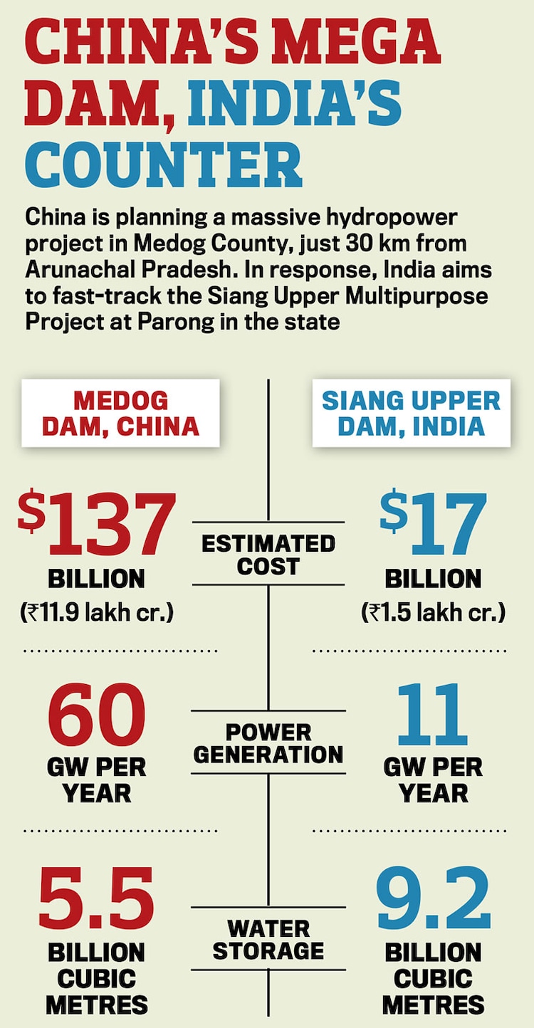 After Beijing announced the Medog Dam, India has accelerated plans for the Siang Upper Multipurpose Project (SUMP)—a colossal hydropower dam in Arunachal Pradesh intended to counter China’s influence over the river. With a proposed capacity of 11,000 MW, SUMP’s reservoir would hold 9.2 billion cubic metres (bcm) of water, compared to Medog’s 5.5 bcm. Estimated at $17 billion (Rs 1.5 lakh crore), it will be India’s most powerful hydroelectric project, designed to regulate water flow, mitigate seasonal droughts and serve as a safeguard against sudden surges from Chinese dams. While feasibility surveys are